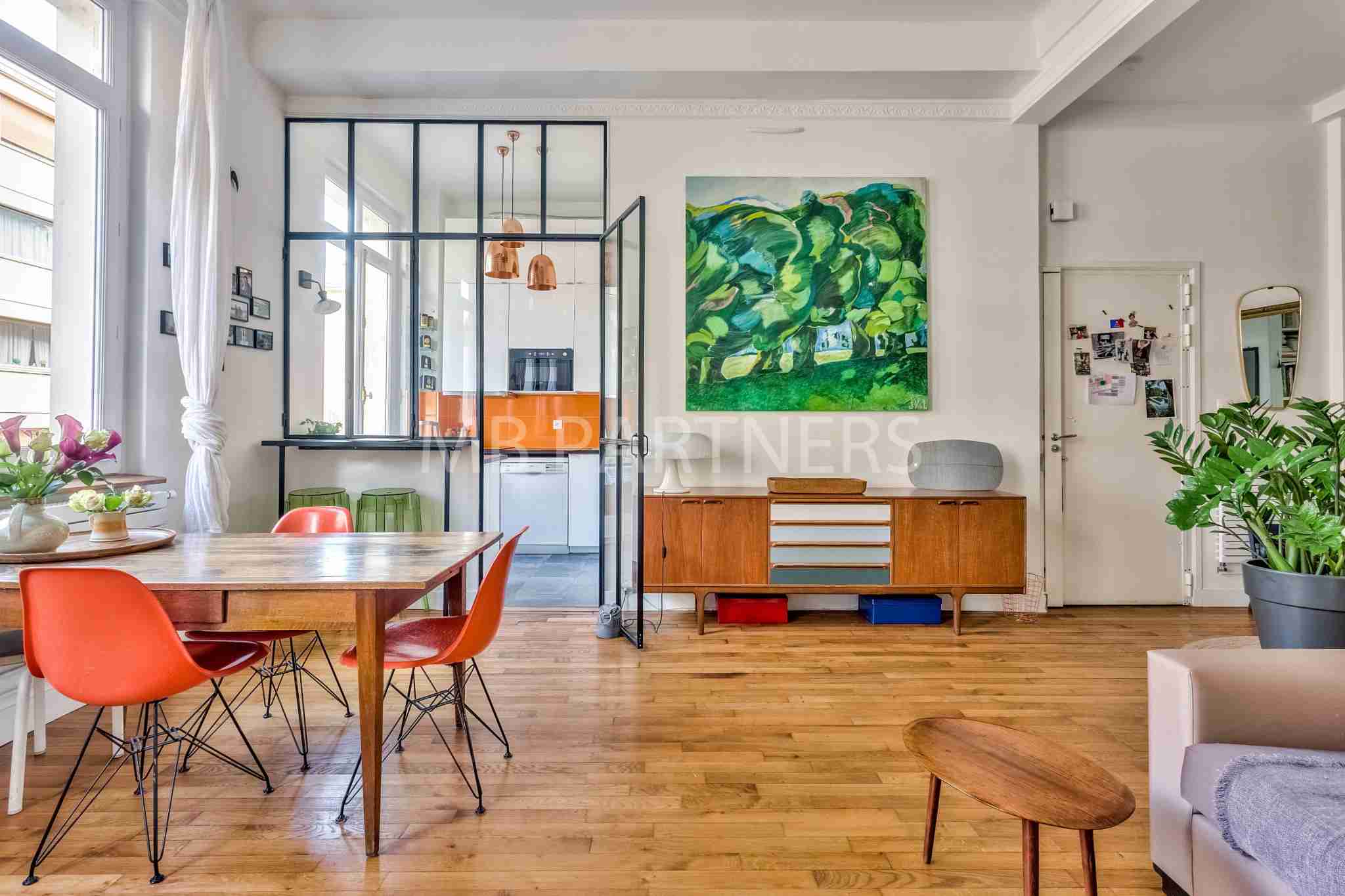 Situé en étage d’un immeuble de 1880 cet appartement traversant de 82m2 Loi Carrez avec une hauteur sous plafond de 3m50, parquet et moulures d’origine, allie charme, calme et luminosité.
