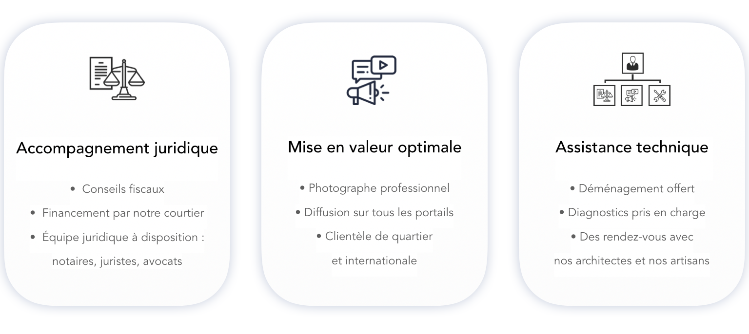 Dans la vente, l’achat ou la mise en location d’un bien, nous voyons un projet de vie avant une transaction. C’est pour cette raison que nous avons à coeur de prodiguer un accompagnement de grande qualité par son aspect complet, global, précis et utile. En plus de la mise à disposition de notre important réseau de partenaires, nous offrons par ailleurs les diagnostics et même le déménagement à nos vendeurs.